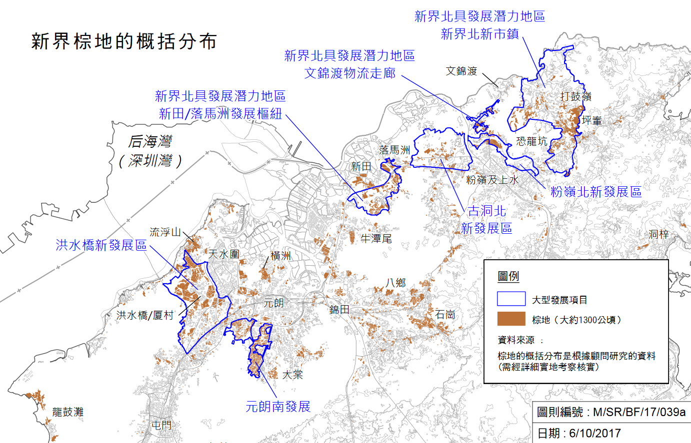 由於棕地往往是無序發展,每塊面積細少,土地零碎,要作大規模的發展往往要一段長時間。究竟有多零碎呢?根據土木工程拓展署2017年10月提供立法會的文件,估計新界約有1,300公頃棕地,當中四個新發展區內就就有540公頃。以洪水橋新發展區為例,714公頃的土地中包括190公頃受影響棕地,佔26.6%。當中約90%屬私人土地(包括集權擁有的祖堂地),夾雜於農業活動、村屋、寮屋之間,涉及逾300個經營者和約3,000個工人。政府要預留24公頃土地,將部分受影響的棕地作業重置到多層樓宇及露天用地,另外又要預留37公頃土地作現代物流設施,更要研究另一幅位於元朗工業區附近約3.8公頃的土地作相類用途。